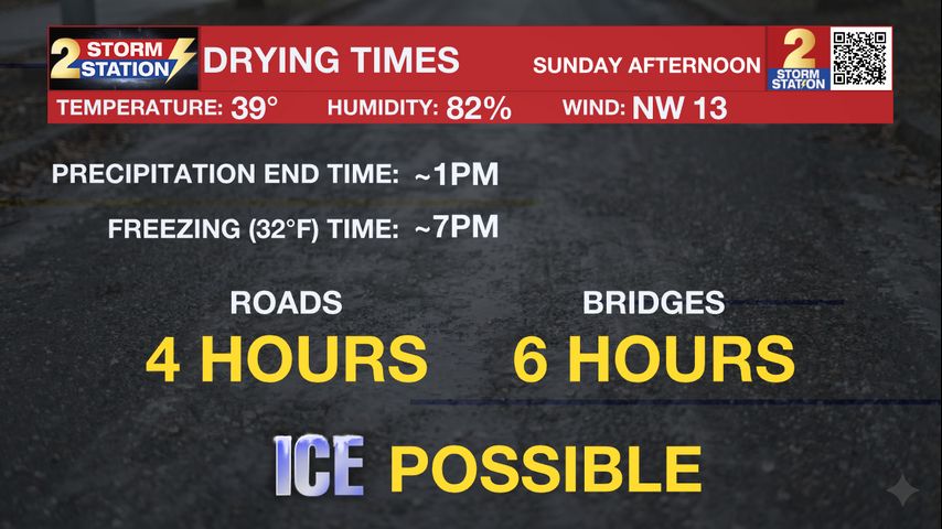 As precipitation ends across the Capital Area, temperatures will stall in the low to mid 30s. Some drying of surface streets and bridges is expected, but patchy ice remains possible as a hard freeze sets in overnight Sunday into Monday.