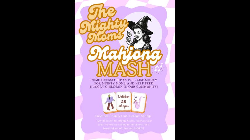 The Mighty Moms' Mahjong Mash starts at 6 p.m. at the Greystone Country Club in Denham Springs. The group encourages wearing costumes to come play mahjong, with any donation to the group reserving a seat at the event.