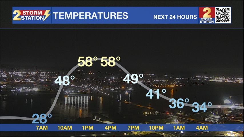 Today and tonight: Monday starts cold across the Capital Region, especially north of I-12. Sunshine dominates through the day, allowing highs to recover into the mid to upper 50s. A reinforcing push of cool air arrives late in the afternoon, keeping conditions dry but limiting additional warming. Monday night remains chilly, with another round of near-freezing to sub-freezing temperatures possible north of the metro, while areas farther south stay slightly above freezing.