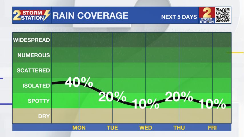 The first full week of June begins with the chance for isolated afternoon storms but will take a drier, and warmer turn by Tuesday. Peak heat index values each afternoon will near the 100° mark.