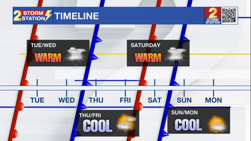 Tuesday/Wednesday: A warm front will surge northward through the Capital Area on Monday night, making things warm again. Near-record warmth will be a possibility on Tuesday and Wednesday as highs soar into the lower and middle 80s. You may run into a spotty shower Tuesday afternoon or evening, but the first widespread round of rain will arrive Wednesday. The shower and storm activity on Wednesday is supported by a cold front that will try to push through the region during the day.