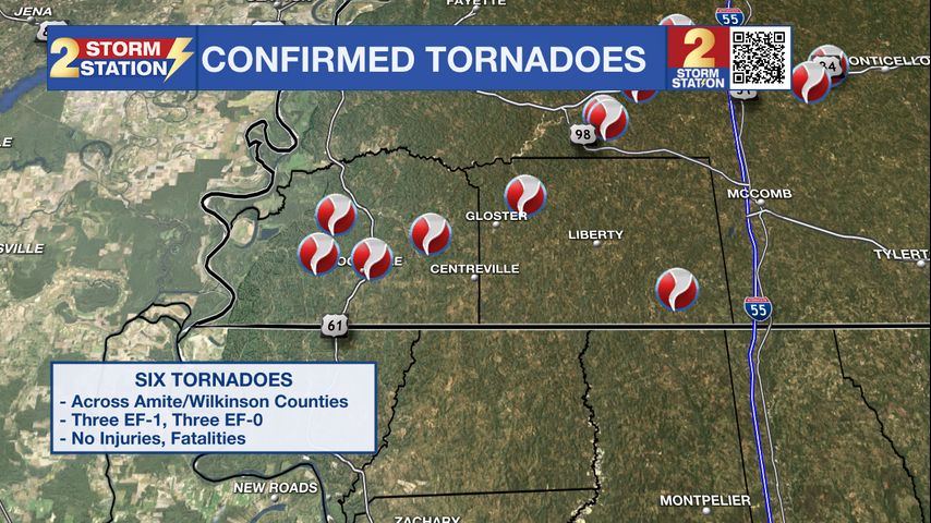 The National Weather Service (NWS) has concluded their damage surveys in the Capital Area from Saturday night's severe weather episode. Six tornadoes have been confirmed in southwest Mississippi, across Amite and Wilkinson Counties. It should be noted that some of the tracks in Wilkinson County might be longer in reality, but survey efforts were limited by dense forest and a lack of accessible roads.