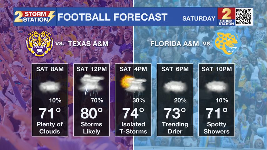 If you’re heading out to tailgate ahead of Southern’s 4 p.m. kickoff or LSU’s 6:30 p.m. game at Tiger Stadium, plan for showers and storms through the afternoon and keep an eye on the radar and have a safe place to go if there’s lightning. The next line of storms is expected to move in later tonight, hopefully avoiding the games. Winds will stay gusty. Overnight storms may become strong or severe with locally brief heavy downpours. Temperatures on Sunday will reach 80 before drier air arrives late in the day.