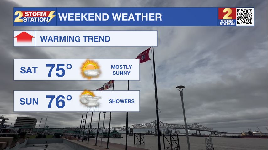 Today and tonight: Saturday morning starts cool, with some locations dipping into the 30s around Baton Rouge. Temperatures rise quickly after sunrise as southerly winds return, pushing afternoon highs into the low to mid 70s. Tonight stays mild with increasing clouds and lows settling into the 50s, with only a slight chance of a sprinkle or two late.
