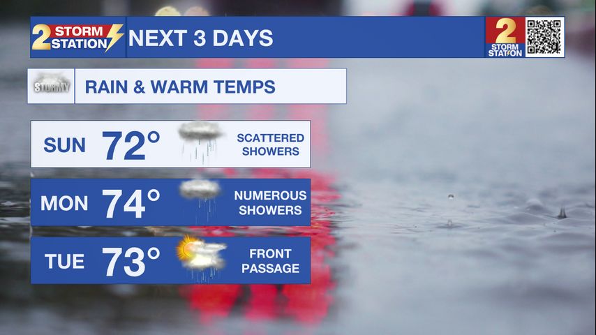 Up Next: Rain chances will increase even further Sunday night, with heavy rain becoming a possibility. Showers stay likely on Monday, with temperatures staying above average. These conditions will last through Tuesday, before our next cold front moves through. 2-4" of rain will be possible Sunday through Tuesday. Heavy rainfall could cause some nuisance flooding all three days. The rest of the week will feature a lot of sunshine, highs near 60 degrees, and lows in the 30's.
