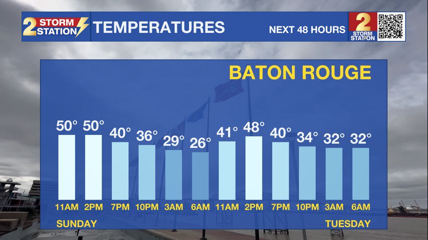 What to look out for: The most impactful weather arrives tonight through Monday morning. A widespread freeze is expected across the Baton Rouge area, with several hours below freezing likely. Gusty north winds will push wind chills into the teens and 20s, creating dangerous cold exposure conditions. Cold Weather Advisories are in effect, and some northern locations may approach more severe cold thresholds. Residents should take precautions to protect pets, pipes, plants, and anyone spending extended time outdoors.