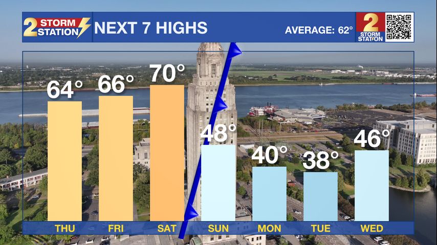 Late Saturday, a strong cold front will move through Louisiana, bringing very cold and dry air back to the region. The chill will be felt Sunday as temperatures are limited to the 40s all day despite plenty of sunshine. Sunday will also be breezy behind the front with winds out of the North between 10-20 mph. By the start of the new workweek, the real winter chill will kick in. Mornings through midweek will dip into the 20s with highs struggling to warm past the 40 degree mark. Clouds will be around as well.