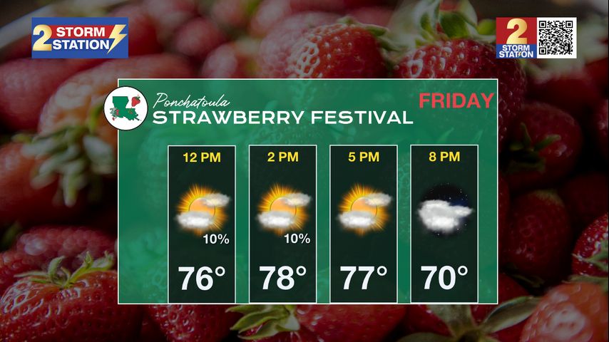 Tonight & Tomorrow: Some low clouds will remain overhead into the night. Along with east winds of 10-15mph, low temperatures will stop in the upper 50s. On Friday, a mix of sun and clouds will allow high temperatures into the low 80s. A spotty shower or thunderstorm could flare up with daytime warming, with rain coverage in the 30% range for our 13 Parish, 2 Country Forecast Area.