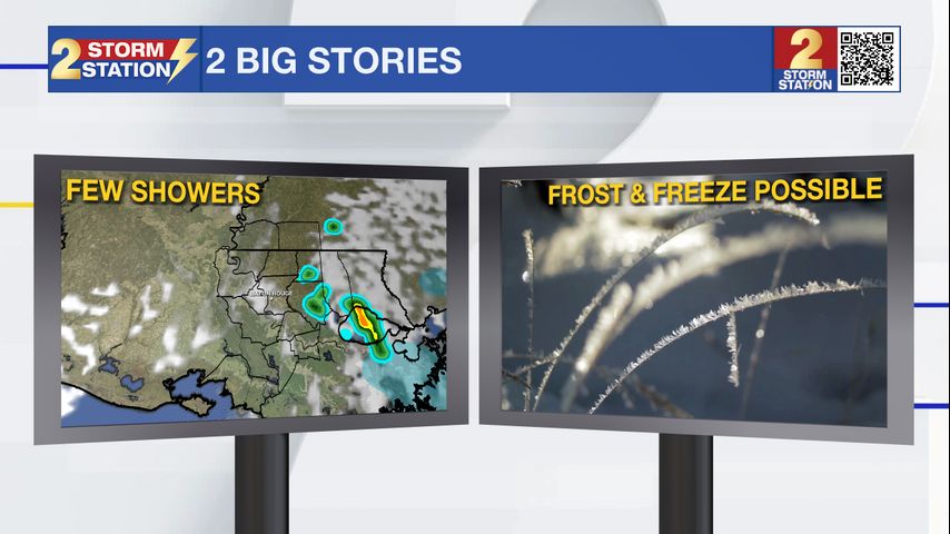 The big plunge in temperatures will follow Sunday night into Monday. After starting off in the upper 30s, temperatures will remain in the 50s despite full sunshine. The coldest temperatures will be felt on Tuesday morning. As winds calm, clear skies will allow temperatures to fall back into the low 30s with frost possible as far south as I-10 and a freeze possible as far south as I-12, especially likely north and east of Baton Rouge. With the potential for freezing conditions, use the weekend to take necessary precautions for sensitive plants and ensure pets will have access to warmth.