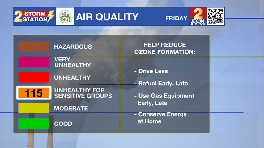 An *AIR QUALITY ALERT* is in effect for the Baton Rouge Metro Area through the end of the week. Light northwesterly winds will limit air dispersion and carry regional pollutants, including wildfire smoke, across Louisiana. In addition, partly sunny skies and highs in the low- to mid-90s will enhance ozone formation. Therefore, despite isolated thunderstorms reducing ozone at times, AQI levels are expected to be Unhealthy for Sensitive Groups all three days. Those with breathing sensitivities should avoid prolonged outdoor exertion.