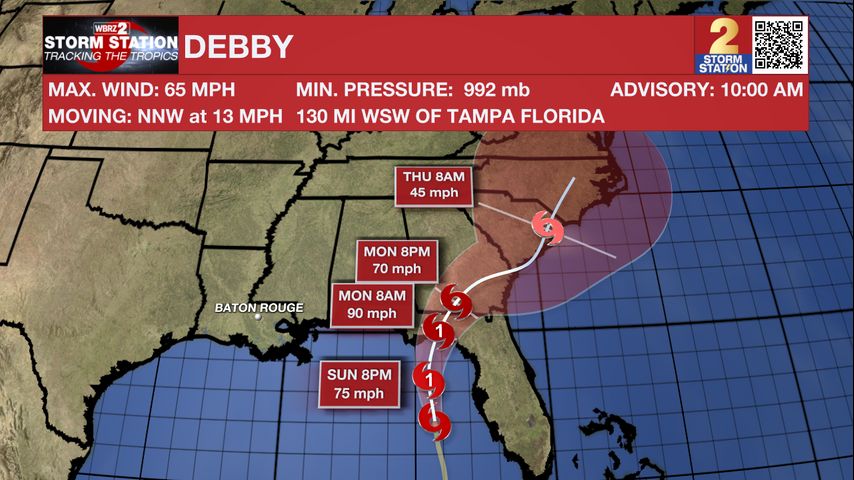 Tropical Storm Debby is in the eastern Gulf of Mexico. This storm has winds topping out at 65 mph and it is moving NNW at 13 mph. Debby will track through the eastern Gulf of Mexico, before making landfall as a Hurricane early Monday. This system poses no direct threat to Louisiana.