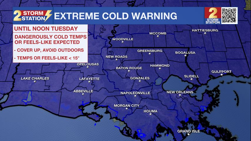 Today and tonight: We begin the day with another frigid morning. Temperatures are below freezing over the entire area, with most areas in the upper teens and lower 20s. An Extreme Cold Warning remains in effect until noon. Sunshine should help temperatures recover into the mid to upper 40s by afternoon — still well below normal. Skies remain clear Tuesday night, allowing temperatures to fall back toward freezing once again.