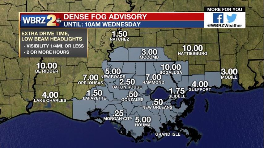 A *DENSE FOG ADVISORY* is in effect until 10am Wednesday for all of southeast Louisiana and southern Mississippi. Fog may cause visibility of one-quarter mile or less. If driving, slow down, use your headlights, and leave plenty of distance ahead of you.