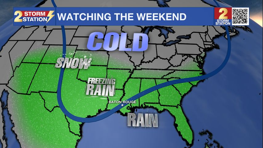 Winter Storm Potential: Saturday will be a day of chilly, steady, or even falling temperatures. A surge of cold air will plunge across the country toward the Gulf Coast while a large winter storm develops across the Southern United States with large swaths of snow, ice, and rain. Focusing on the Baton Rouge Metro Area, periods of rain are expected through the daytime hours. Saturday night through early Sunday, continued falling temperatures could result in some locations transitioning from plain rain to freezing rain, especially north and west of the city, closer to Mississippi. The greatest risk for accumulating ice will be along and north of a line from St. Francisville to Kentwood. For the I-10/12 corridor, the chance of accumulating ice is lower. However, as temperatures eventually do drop below freezing everywhere later Sunday, any wet surfaces could freeze—especially bridges and overpasses.